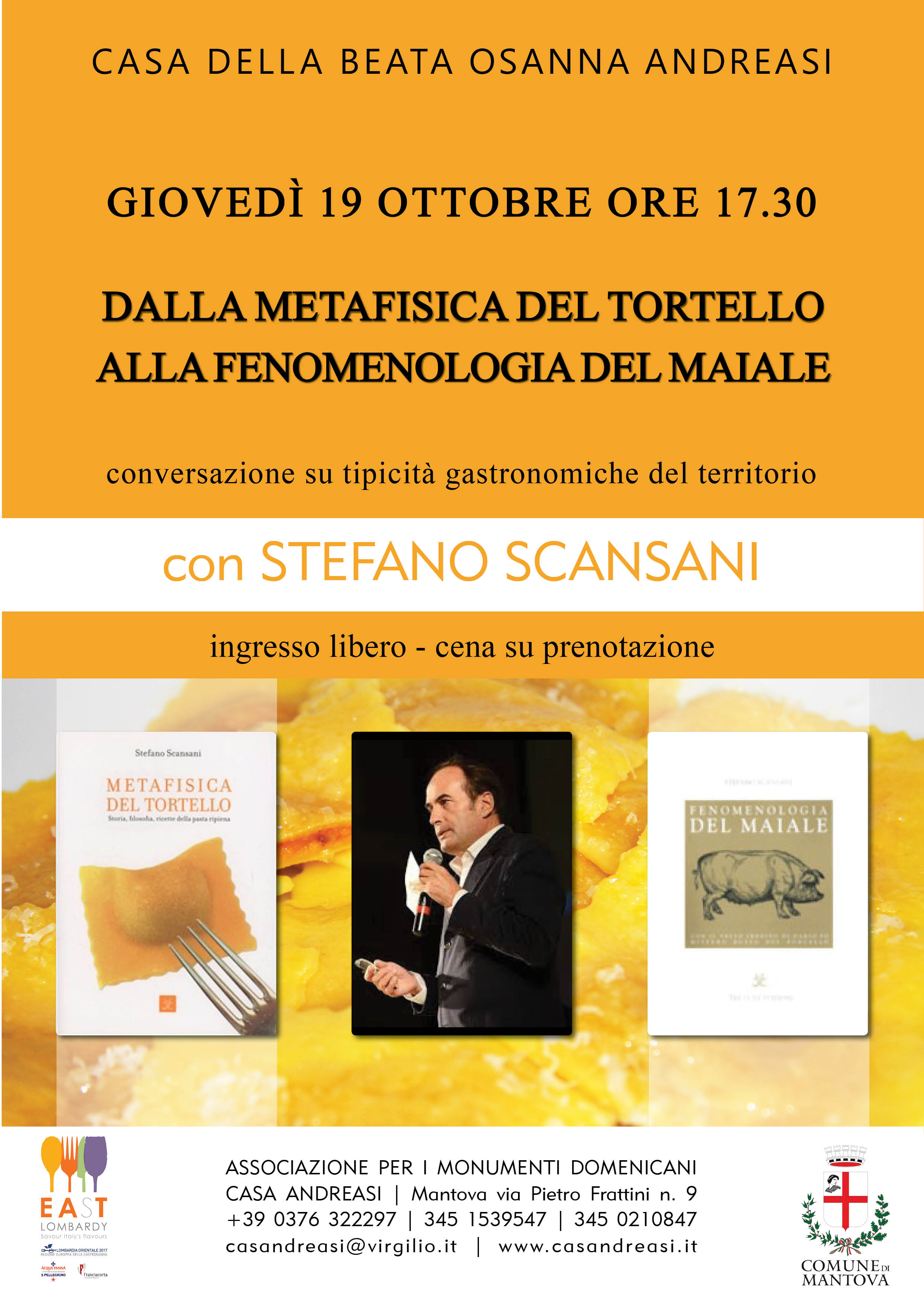 Dalla Metafisica del tortello alla Fenomenologia del maiale – STEFANO SCANSANI Giovedì 19 ottobre ore 17.30 CASA ANDREASI Stefano Scansani, giornalista e scrittore, con numerosi titoli di successo al suo attivo, ha diretto la pagina culturale della Gazzetta di Mantova ed è oggi direttore della Gazzetta di Reggio. Condividi: Condividi su WhatsApp (Si apre in una nuova finestra) WhatsApp Condividi su Facebook (Si apre in una nuova finestra) Facebook Condividi su X (Si apre in una nuova finestra) X Condividi su Pinterest (Si apre in una nuova finestra) Pinterest Condividi su LinkedIn (Si apre in una nuova finestra) LinkedIn Invia un link a un amico via e-mail (Si apre in una nuova finestra) E-mail Stampa (Si apre in una nuova finestra) Stampa Mi piace Caricamento... Correlati Lascia un commento Cancella risposta Δ