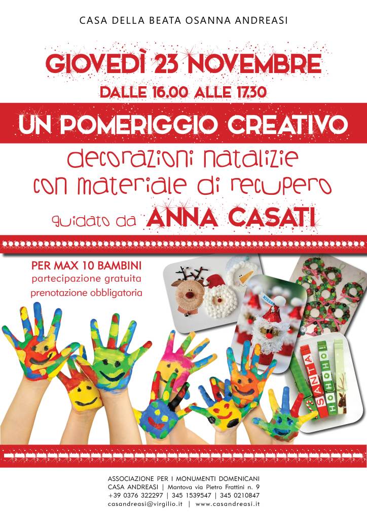 UN POMERIGGIO CREATIVO – Anna Casati giovedì 23 novembre dalle 16.00 alle 17.30 CASA ANDREASI Decorazioni natalizie con materiale di recupero guidato da Anna Casati per max 10 bambini. [partecipazione gratuita – prenotazione obbligatoria] Condividi: Condividi su WhatsApp (Si apre in una nuova finestra) WhatsApp Condividi su Facebook (Si apre in una nuova finestra) Facebook Condividi su X (Si apre in una nuova finestra) X Condividi su Pinterest (Si apre in una nuova finestra) Pinterest Condividi su LinkedIn (Si apre in una nuova finestra) LinkedIn Invia un link a un amico via e-mail (Si apre in una nuova finestra) E-mail Stampa (Si apre in una nuova finestra) Stampa Mi piace Caricamento... Correlati Lascia un commento Cancella risposta Δ