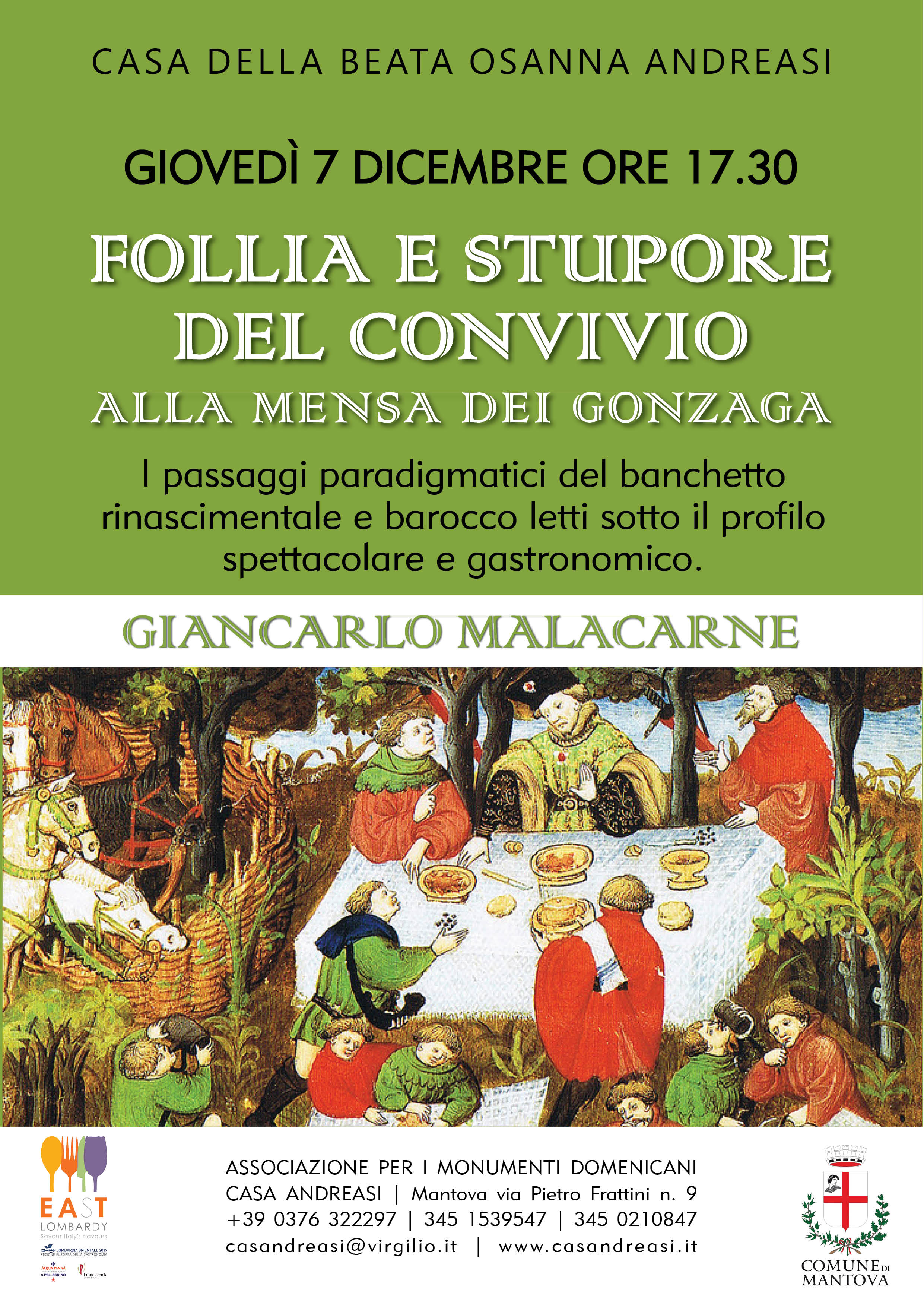FOLLIA E STUPORE DEL CONVIVIO – GIANCARLO MALACARNE Giovedì 7 dicembre ore 17.30 CASA ANDREASI I passaggi paradigmatici del banchetto rinascimentale e barocco letti sotto il profilo spettacolare e gastronomico. Condividi: Condividi su WhatsApp (Si apre in una nuova finestra) WhatsApp Condividi su Facebook (Si apre in una nuova finestra) Facebook Condividi su X (Si apre in una nuova finestra) X Condividi su Pinterest (Si apre in una nuova finestra) Pinterest Condividi su LinkedIn (Si apre in una nuova finestra) LinkedIn Invia un link a un amico via e-mail (Si apre in una nuova finestra) E-mail Stampa (Si apre in una nuova finestra) Stampa Mi piace Caricamento... Correlati Lascia un commento Cancella risposta Δ