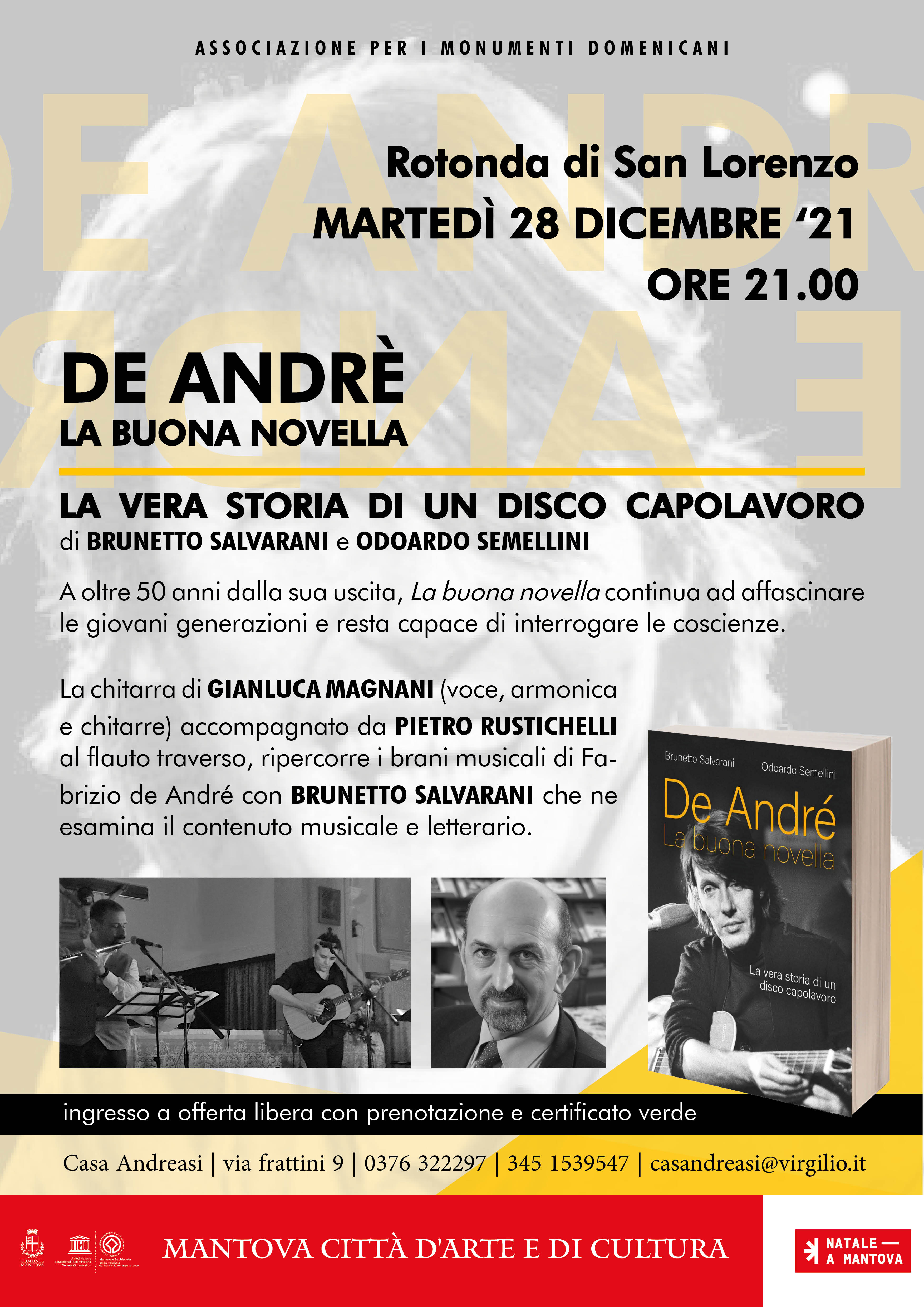 LA VERA STORIA DI UN DISCO CAPOLAVORO Rotonda di San Lorenzo- MARTEDÌ 28 DICEMBRE ‘21- ORE 21.00 DE ANDRÈ – LA BUONA NOVELLA Condividi: Condividi su WhatsApp (Si apre in una nuova finestra) WhatsApp Condividi su Facebook (Si apre in una nuova finestra) Facebook Condividi su X (Si apre in una nuova finestra) X Condividi su Pinterest (Si apre in una nuova finestra) Pinterest Condividi su LinkedIn (Si apre in una nuova finestra) LinkedIn Invia un link a un amico via e-mail (Si apre in una nuova finestra) E-mail Stampa (Si apre in una nuova finestra) Stampa Mi piace Caricamento... Correlati Lascia un commento Cancella risposta Δ