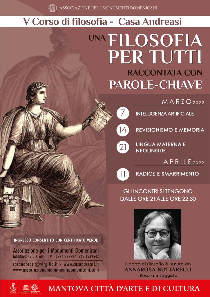 V Corso di filosofia – Casa Andreasi Annarosa Buttarelli – filosofa e saggista7 – 14- 21 marzo e 11 aprile 2022 – dalle ore 21 alle ore 22.30 Condividi: Condividi su WhatsApp (Si apre in una nuova finestra) WhatsApp Condividi su Facebook (Si apre in una nuova finestra) Facebook Condividi su X (Si apre in una nuova finestra) X Condividi su Pinterest (Si apre in una nuova finestra) Pinterest Condividi su LinkedIn (Si apre in una nuova finestra) LinkedIn Invia un link a un amico via e-mail (Si apre in una nuova finestra) E-mail Stampa (Si apre in una nuova finestra) Stampa Mi piace Caricamento... Correlati Lascia un commento Cancella risposta Δ