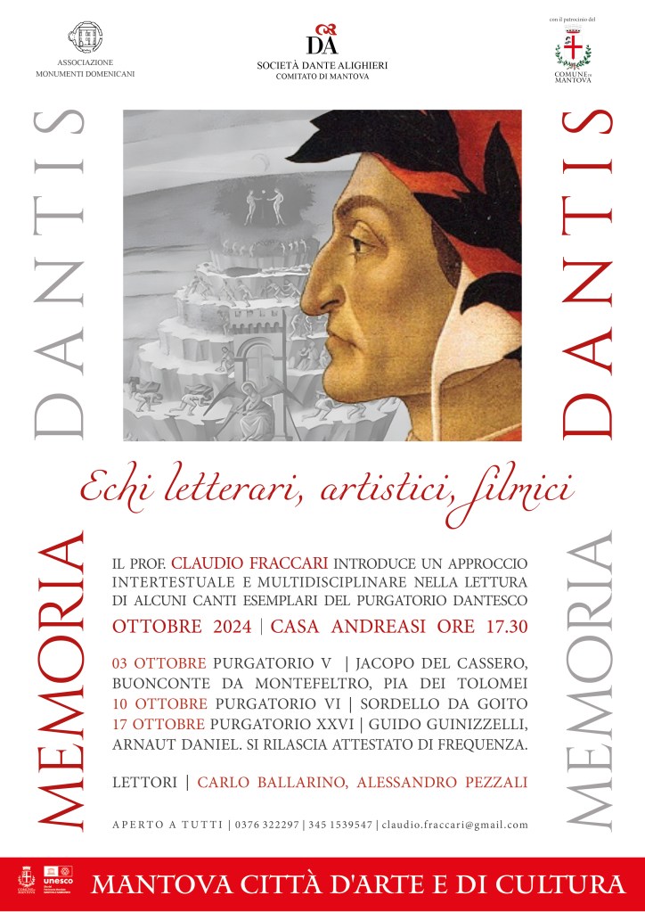 MEMORIA DANTIS Echi letterari, artistici, filmici Il prof. Claudio Fraccari introduce un approccio intertestuale e multidisciplinare nella lettura di alcuni canti esemplari del Purgatorio dantesco Casa Andreasi – OTTOBRE – 03 – 10 – 17 – ore 17.30 Condividi: Condividi su WhatsApp (Si apre in una nuova finestra) WhatsApp Condividi su Facebook (Si apre in una nuova finestra) Facebook Condividi su X (Si apre in una nuova finestra) X Condividi su Pinterest (Si apre in una nuova finestra) Pinterest Condividi su LinkedIn (Si apre in una nuova finestra) LinkedIn Invia un link a un amico via e-mail (Si apre in una nuova finestra) E-mail Stampa (Si apre in una nuova finestra) Stampa Mi piace Caricamento... Correlati Lascia un commento Cancella risposta Δ
